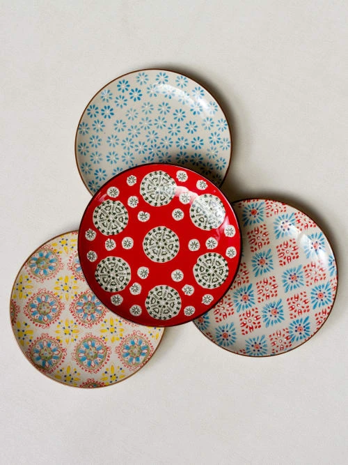 4 assiettes originales décorées. Un ensemble de 4 assiettes plates en céramique Chacune est différente pour amener un peu de fantaisie sur votre table. De la couleur et des motifs inspirés de la vaisselle d’Europe de l’Est. Elles mesurent 20 cm de diamètre. Elles feront de l’effet à l’heure du déjeuner.