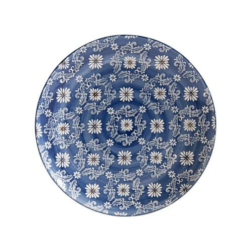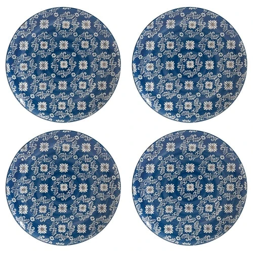 Ce coffret de quatre assiettes plates en grès artisanal saura mettre en valeur vos plus belles créations ! la collection almada, avec son mélange bleu et blanc, est entièrement peinte à la main et faite de grès artisanal. ses motifs en arabesques suggèrent une composition graphique raffinée. sa finition brillante et les légers reliefs apporteront de la bonne humeur dans votre foyer.Collection : Almada Matière : Grès Couleur : Bleu Diamètre : 26 cmCompatible Lave-vaisselle Compatible Micro-onde